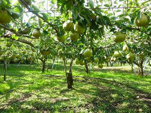上にある写真を見ていただくと分かる通り、棚で栽培されているラ・フランスは、横に広がり、太陽の光が全部の実、葉に満遍なく当たります。