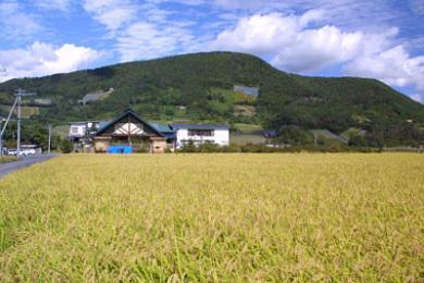 山並みと田園風景、「うめもどき」の真っ赤な実でいっぱいの別世界。