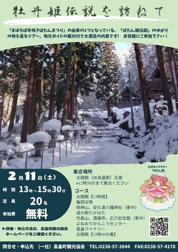 高畠町には「牡丹姫伝説」という伝説があり、ぼたんまつりの由来の一つともなっています。その伝説にゆかりのある地と高畠町の観光名所を地元ガイドと語り部がご案内いたします。