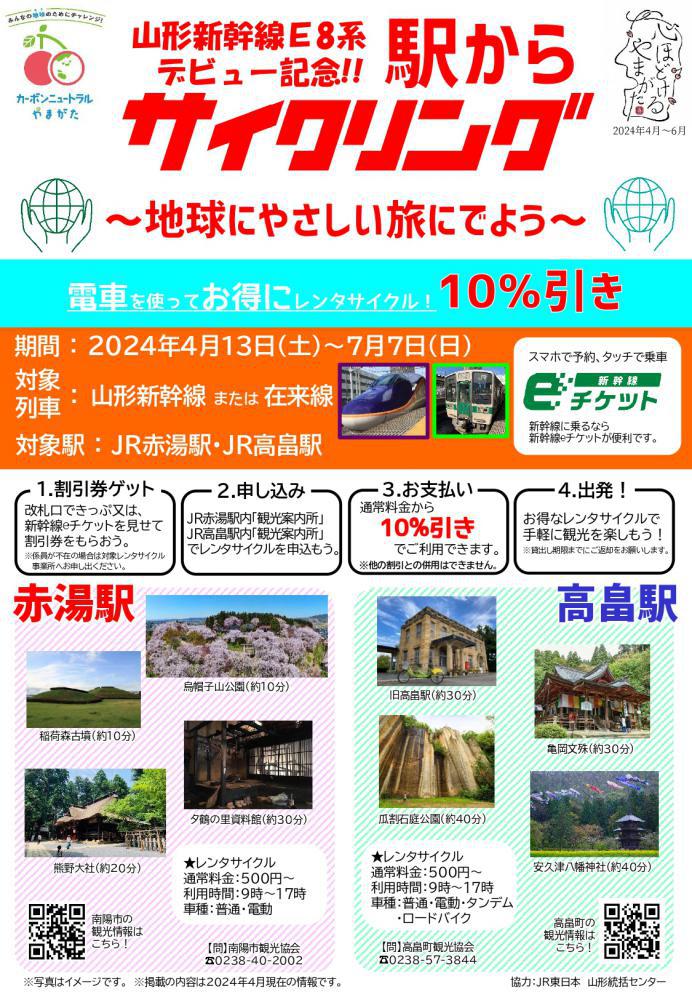 JR高畠駅とJR赤湯駅では、JRを利用された方にレンタサイクルを10%引きでお貸ししております