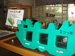 エコガラスの体験器「エコっ手」をご覧ください。器具の赤いスイッチを押して、