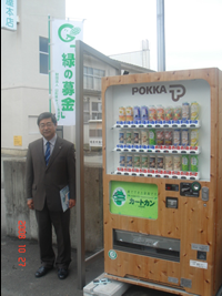 ▼ポッカコーポレーション〜緑の募金ラッピング自販機「東北初」お目見え!!