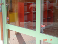 神町幼稚園エントランス、入口引戸には、万が一ガラス面に、ぶつかってもケガを
