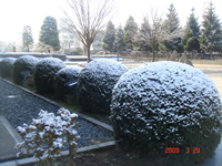 「文翔館」の植え込みに、うっすらと雪が・・・・まるで、「おはぎ」の上に白い