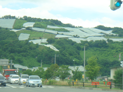 赤湯といえば、名産の「ブドウ」ですが、ご覧のように、ブドウ畑が山間に処狭し