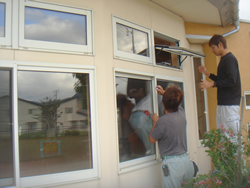 施工手順@まずは、サッシ枠から建具を取り外します。ランマの排煙窓も、金具を
