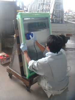 B養生が終わったら、今度はガラス面の汚れを綺麗に取ります。一枚一枚汚れ取り