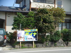 ちょうど道路から見た全体の外観です。看板には「ガイナ」のシンボルとしての