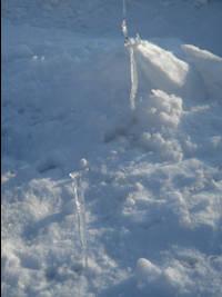 雪に突き刺さった、小さな氷柱(つらら)、「ヒマラヤ杉」の雪から落ちてきた事