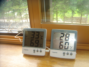 外気温と部屋内部気温の、比較測定を行なっています。今日は梅雨時で蒸し蒸し!