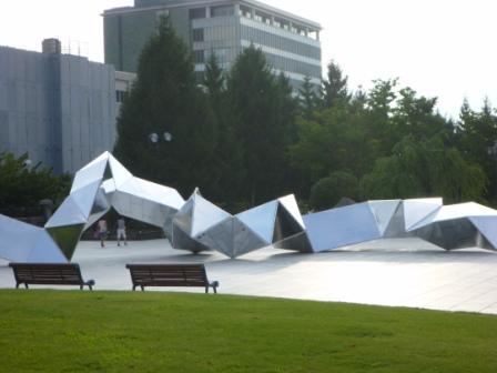 す。画像は、会場の文翔館議場ホールの広場に設置された巨大モニュメントです。