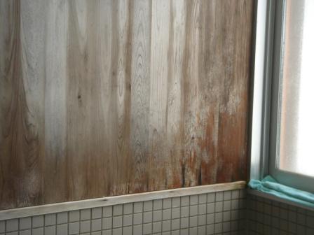 浴室内の壁面〜ヒノキ板が痛んでしまい、表面の変色と同時に、カビが発生!