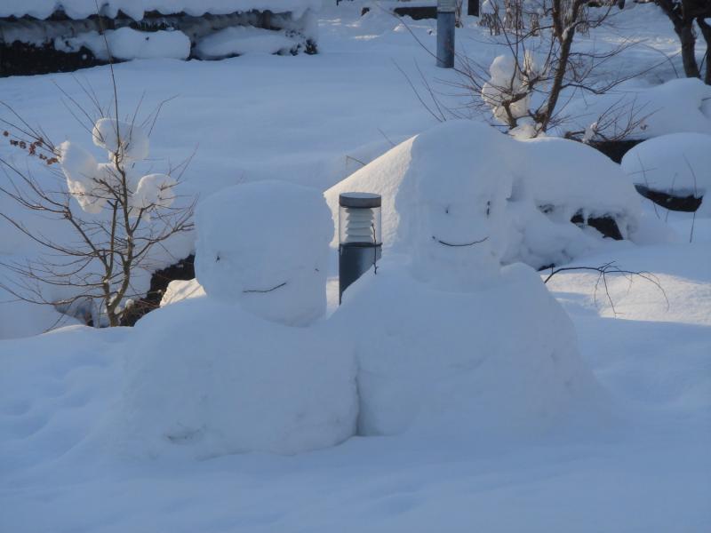文翔館の庭に、芸術作品?「雪だるまセット」発見!表情がいいです。この笑顔を