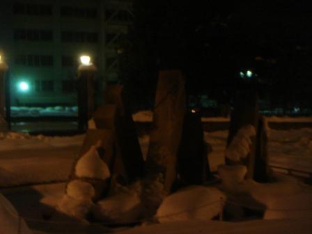 文翔館の広場にあるモニュメント、冬期間は噴水が作動していませんが、夜間照明