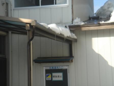 社屋の社員通用口にあるアルミ屋根が、ご覧のように、豪雪のためグニャッと曲が
