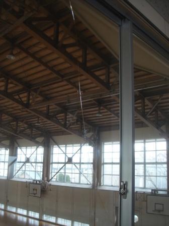 は無かったようですが、体育館アリーナ上部の、トレーニングルームのガラスがご