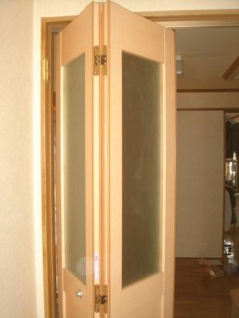 室内リビング入り口の開きドアを改修、従来の片開きドアを、ご覧のように折戸に