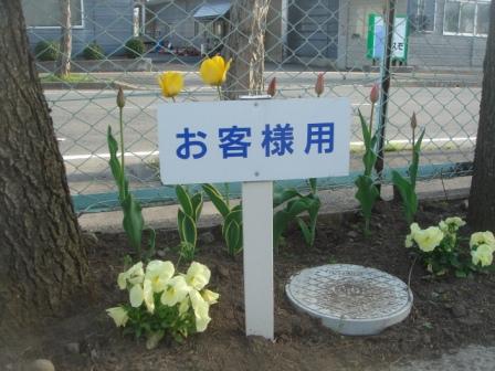 ようやく咲いたチューリップ&パンジー!お客さまのパーキングスペースに植えて