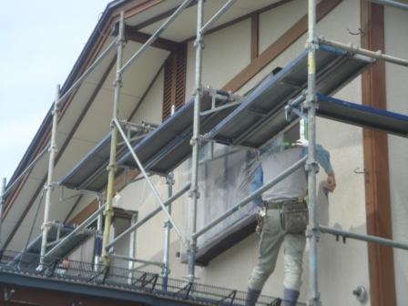 軒天部分の塗装から入り、外部塗装の準備に取り掛かるため、窓との取り合い部分