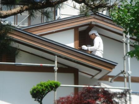 外部の木部塗装も終盤に差し掛かってまいりました。途中で大雨などの天候不順な