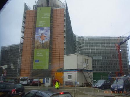 にある欧州連合EU本部の周辺で、独特の青い円形マークが目印です。