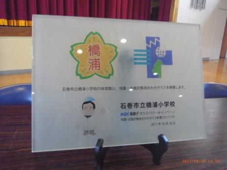 贈呈式のセレモニーの中で、学校側に「証書」をお渡しします。「防災ガラス」の