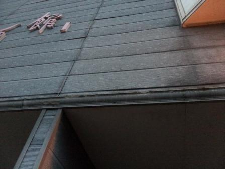 西面のサイディング表面が劣化して、剥がれ落ちています。中央でジョイントして