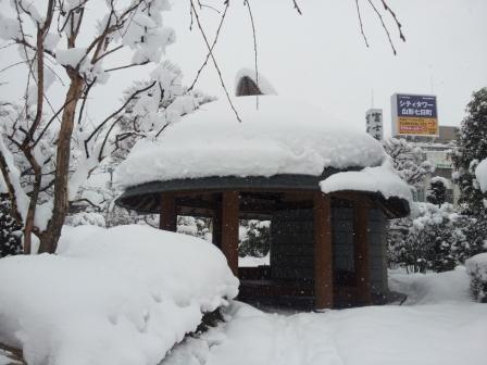 降り続いた雪が「東屋」の屋根面、周囲の樹木もスッポリ包んでくれました。昨日