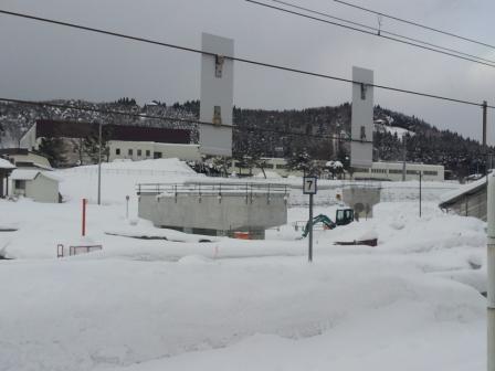 駅構内から、雪に埋もれたコンクリートの橋脚が見えます。3年後の開通を目指す