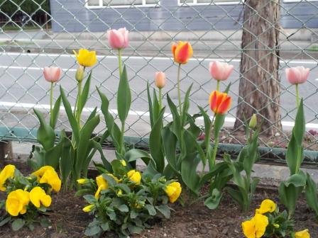 社屋エントランスから道路南側、パーキングの植え込みにチューリップやスイセン