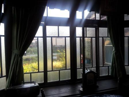 木製出窓に差し込む夕日が、透明ガラスと化粧ガラスとの組合わせにより、柔らか