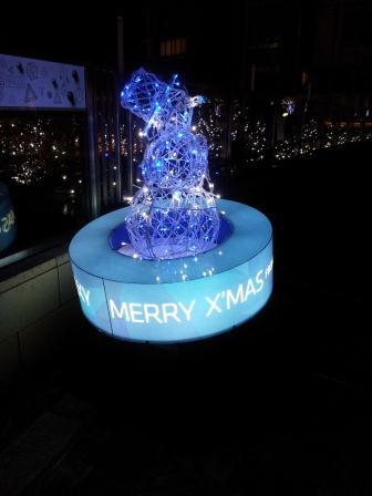 寒空で光を放ち元気なのは、「スノーマン」。青色イルミネーションを纏い、架台