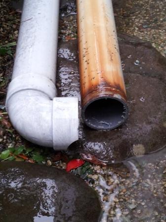 凍結による雨樋補修の様子です。地面から継手まで、冬期間に雨水が凍結し、塩ビ