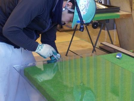 がら、合わせガラスの樹脂フィルムがカットし易いように作業を進めます。