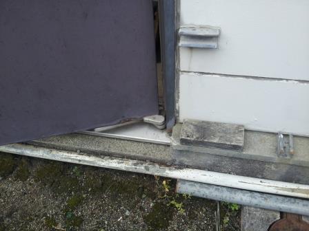 が凹んでいますが、基礎コンクリートに当ってドアが破損、ピポットヒンジが衝撃を