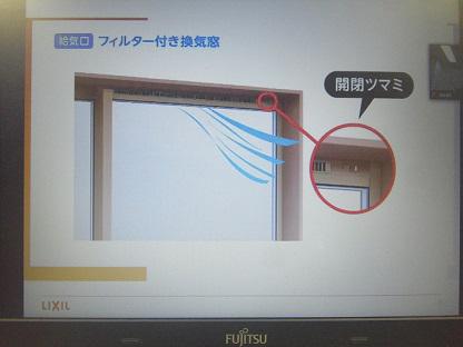 吸気用のエアブレスを、引き違い窓の上部に取り付けることによって、外部からの空気を室内に取り込むことが可能です。フィルター付きの換気ブレスです。開閉用ツマミを左右にスライドさせることによって、換気量を調整することが出来ます。