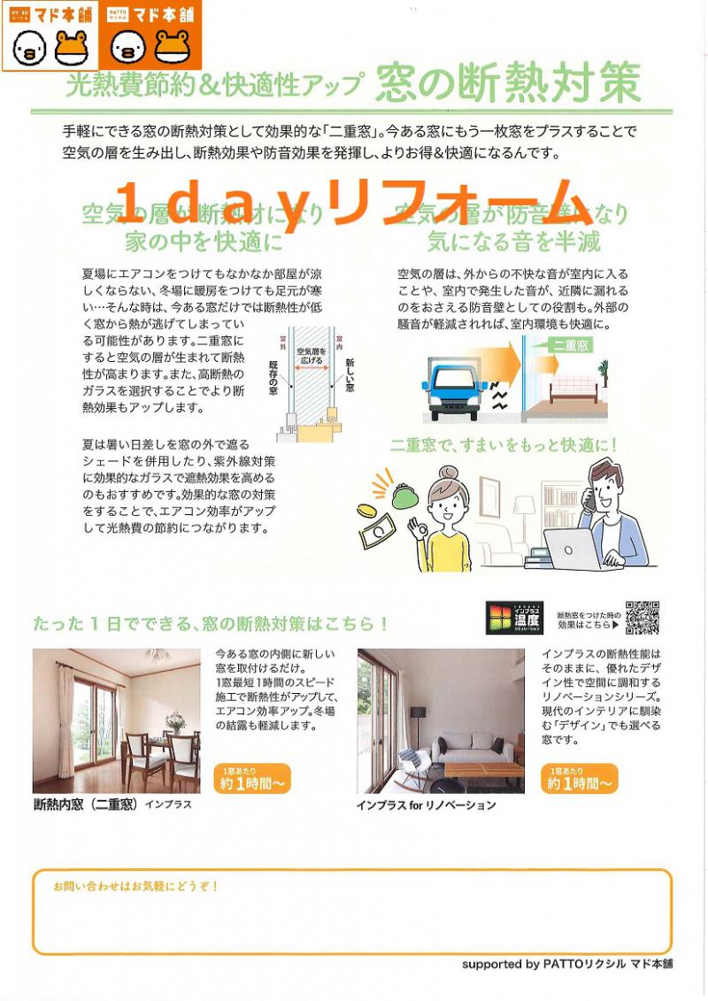 ❶断熱内窓(二重窓)インプラス:今ある窓の内側に新しい窓を設置するだけ