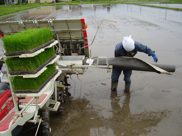 この田植えは専用の田植え機で行います。また、取り付ける紙(紙マルチ)は凄く重く女の人には無理かな?