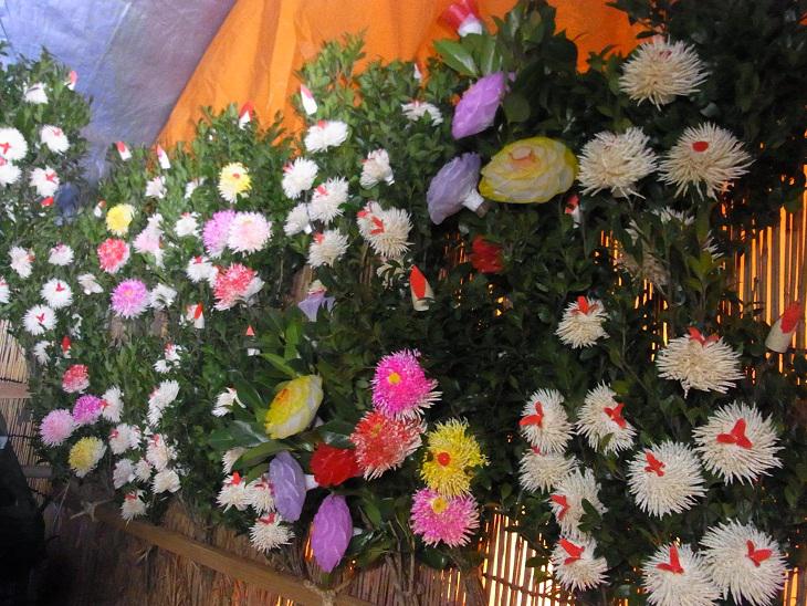 その花に赤や黄、ピンク等の色を塗り、花をツゲの枝に取り付けて完成です。