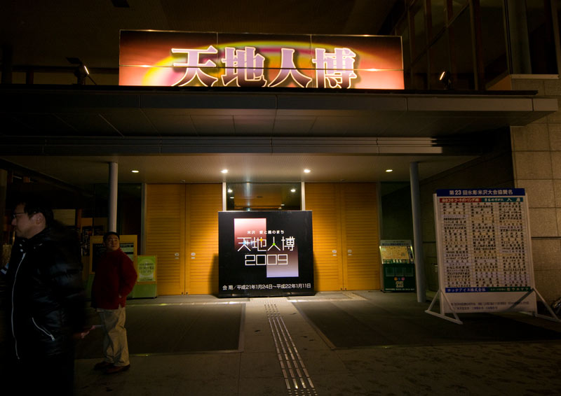 天地人博が行われている伝国の杜の正面玄関の様子です。 ここ玄関わきでは氷の彫刻など準備作業が行われていました。