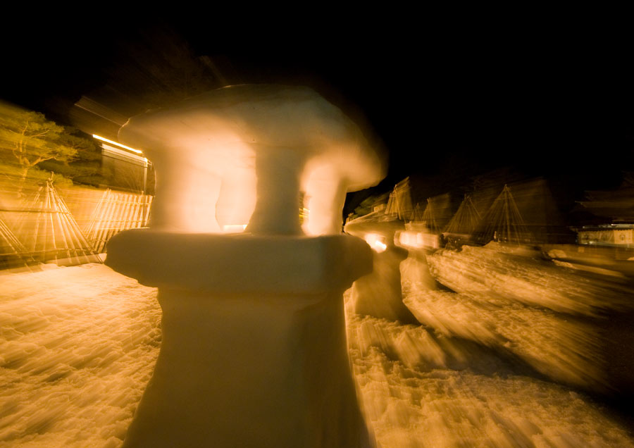 上杉記念館前の雪灯ろうです。 ここの灯ろうは1日遅く作ったようなので、痩せていませんでした。 露光間ズームで撮ってみました。