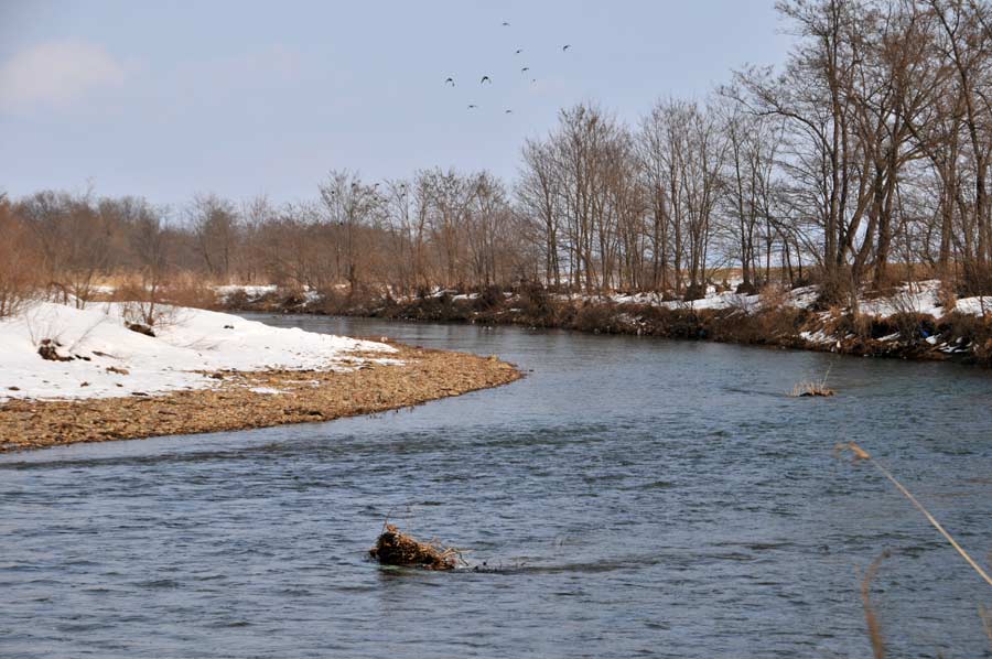 今日、置賜駅の1km位南の最上川の上流の松川を撮ってみました。 雪がすくないですね。