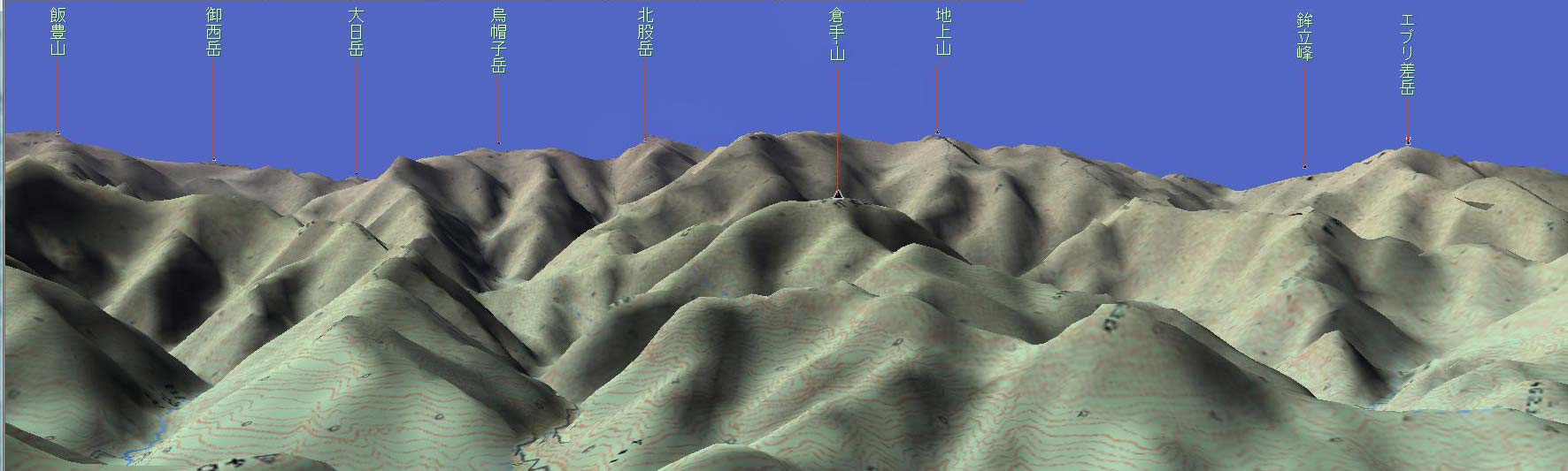 カシミール3Dで樽口峠からの眺めを作ってみました。 このソフトを使いこなせないので幼稚な画像ですが山の名前も入れてみました。 画像をクリックしてから右側をスクロールしてみてください。