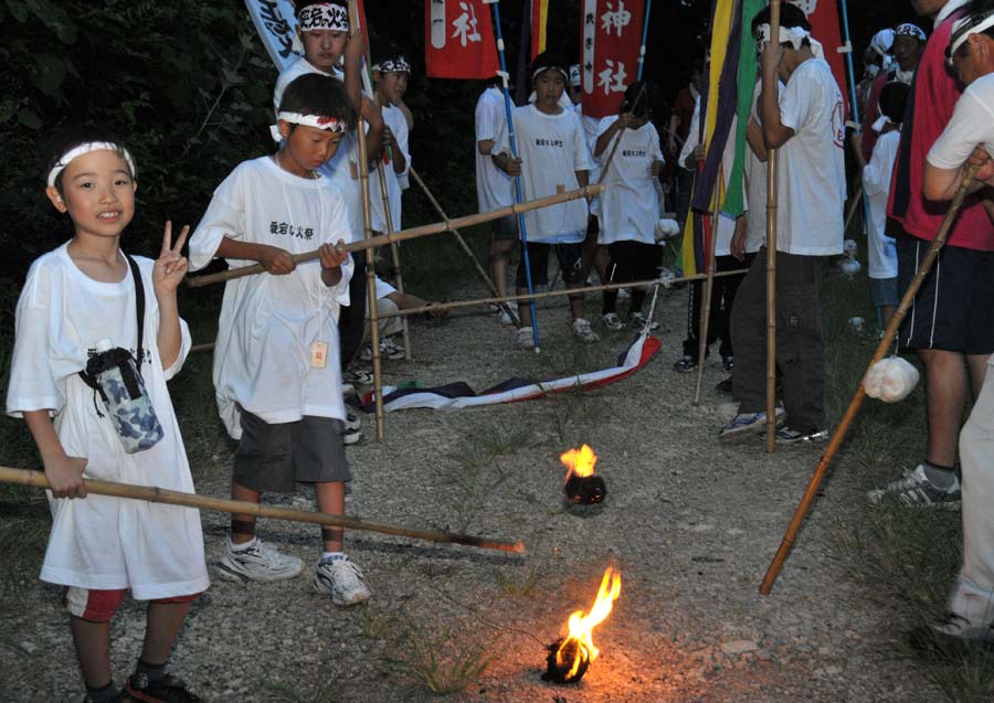 子供たちも先導をつとめます。 休憩中の様子です。 途中から雷雨があり、私は途中から山を下りてきました。 この火祭りは来年で30周年を迎えるそうです。 お粗末さまでした。