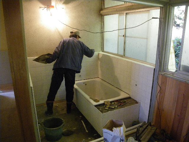 浴槽のエプロンを貼り、目地材を塗っていました。