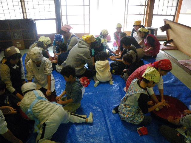 伊佐沢小学校の4年生の親子さんが賑やかに蕎麦打ちを楽しんでいかれました。