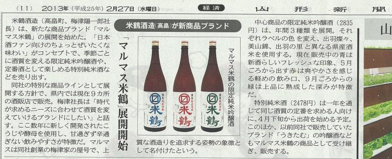 2013年2月27日付の山形新聞朝刊11面(経済面)で、2012年12月から展開している「マルマス米鶴」が紹介されました。
