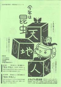 天の巻 空を飛ぶ 大迫力の飛翔シーン 地の巻 土の中をのぞいてみよう これは何?土の中は不思議がいっぱい! 人の巻 戦国武将と虫たち かねたんもびっくり!虫たちが大活躍! 春の展示「昆虫天地人−天の巻 空を飛ぶ−」 5月2日(土)〜6月28日(日) 昆虫たちが飛ぶのはなぜ?飛ぶことを中心とした 昆虫たちの不思議や生活を紹介します。 夏の特別展 「昆虫天地人」 天地人それぞれのテーマで いろいろな虫たちの姿を 標本・写真・模型などで展示します。 発見いっぱいの昆虫ワールドを楽しめます! 年間行事 ・カブトを作ろう ・みさわ昆虫学校 ・標本教室 ・空き箱で昆虫を作ろう! よねざわ昆虫館 三沢コミュニティーセンター内 〒992-0077 米沢市大字簗沢1776−1 開館時間 9時〜17時 入場無料 11月30日まで無休 以降水曜休館 12/29〜1/3 休館 電話0238-32-2005 FAX0238-32-2939 ...もっと詳しく |