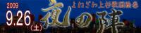 「よねざわ上杉戦国絵巻 夜の陣」開催いたします! 日時 平成21年9月26日(土)午後6時から 会場 松川河川敷(上杉まつり川中島合戦会場) 入場無料 有料桟敷席設置 公式ホームページはこちら http://www.uesugi-festa.com/ 配役募集!7月1日より受付いたします! ぜひご参加ください! 上杉謙信公、武田信玄も募集! オーディションで選考! 本陣大将、雑兵は50名募集いたします! 今回は、参加される皆様とともに作り上げるイベント 参加者が気持も一体となって 戦の陣形、戦闘シーンを魅せていただきます。 ※参加希望の方は9/5(土)・6(日)の2日間で、 米沢の史跡等を巡りながら 川中島合戦の経過や米沢の歴史を学んでいただき、 本番に備え、事前に練習を行う予定です。 また、歴史講座及び練習会を通じ、参加される方に 交流を深めていただくため、合宿形式の宿泊プラン(遠方の方)や 催し(山形名物”いも煮会”)等も考えております。 尚、宿泊・食事等に関しては、参加者にあまり負担にならない金額で、 現在調整中です。 詳しくは公式ホームページでご確認ください http://www.uesugi-festa.com/ 同時にボランティアも募集しております! 交通誘導、会場案内等、「米沢上杉戦国絵巻夜の陣」を サポートしていただけるボランティアスタッフを募集します。 高校生又は16歳以上の体力に自信のある方であれば誰でもOK! おまつり成功のためにお手伝いしていただけませんか? 詳しくは公式ホームページをご覧下さい! 「よねざわ上杉戦国絵巻 夜の陣」とは 米沢の春の祭典「米沢上杉まつり」。 米沢上杉家の家祖である上杉謙信公を祀る上杉神社、 名君上杉鷹山公、上杉景勝公、直江兼続公などを祀る 松岬神社の春の例大祭として、古くより市民に親しまれてきました。 今年は大河ドラマ「天地人」の放送を記念し、 新しい秋の祭典として 「よねざわ上杉戦国絵巻夜の陣」を開催します。 9月26日土曜日午後6時、 夜の松川河川敷に「川中島合戦」が再現されます。 戦国史上最大の死闘といわれた上杉軍と武田軍が激突する 「川中島合戦」(永禄4年秋)。火縄銃の発砲、 上杉謙信公が単騎で武田軍に斬りこむ「三太刀七太刀」、 千曲川を渡り押し寄せる高坂隊等の名場面が、 照明の中幻想的に蘇ります。 夜の松川河川敷では周りの景色も消え、 灯りに照らされた舞台だけが闇に浮かび上がります。 その幻想に興奮を感じ、今までの「川中島合戦」では 気づくことのなかったものも見えることでしょう。 松川河川敷という巨大なスクリーンに映し出される 戦国絵巻が皆様を戦国時代へ誘います。 400年前の川中島にタイムスリップする感動を味わいください。 この時期米沢は実りの秋を迎え、郷土料理の芋煮や美味しい新米、 美しい紅葉もお楽しみいただけます。 ぜひよねざわ上杉戦国絵巻夜の陣にお越しください。 |