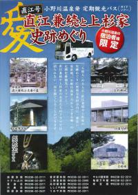 小野川温泉発 定期観光バス(ガイドツアー) 直江兼続と上杉家史跡めぐり 直江号 天地人の主人公・直江兼続や上杉家の史跡めぐりに便利な 米沢市内に一番近い温泉地「小野川温泉」だからできる 唯一の定期史跡観光バスツアー 直江兼続や上杉家の名君たちの ドラマでは語られない一面を観て知ることができます。 ※専属ガイド1名がバスに乗り込み、観光地のご案内をいたします。 増発のバスにはガイドは乗車しません。 運行日 平成21年5月2日から12月13日までの 土曜日、日曜日、祝日 運行 料金 大人2400円 子供1700円 予約方法 小野川温泉の宿泊旅館へ直接 電話またはFAX等で予約が必要です。 詳しくは裏面をご覧下さい。 ...もっと詳しく |